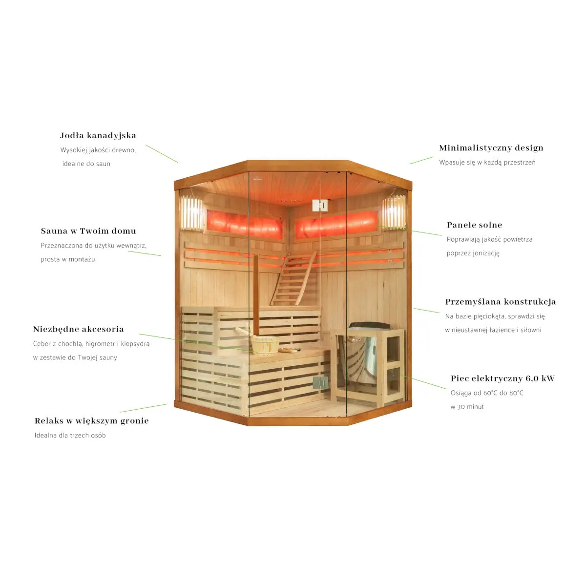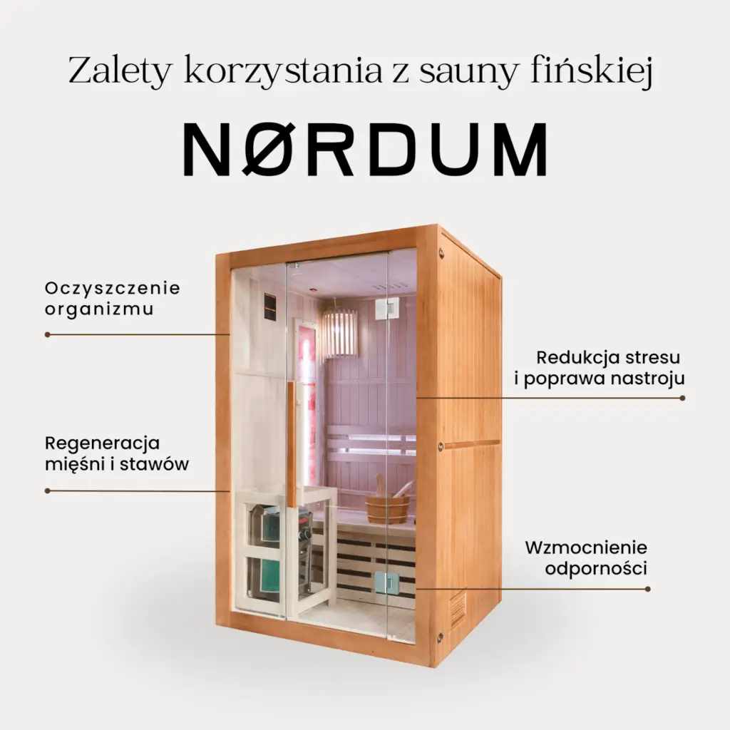 Odkryj prawdziwe źródło relaksu i odprężenia dzięki modelowi Nordum Solea 3-osobowemu, zaprojektowanemu z myślą o komforcie i estetyce. Ta wyjątkowa sauna fińska narożna, przeznaczona dla 3 osób, jest doskonałym wyborem dla każdego, kto pragnie zanurzyć się w błogim cieple i odświeżyć ciało oraz umysł. Model wyróżnia się nowoczesnym designem i funkcjonalnością. Eleganckie wykończenie z drewna oraz precyzyjne spasowanie poszczególnych elementów podkreślają jej wyjątkowy charakter. Ponadto sauna jest prosta w złożeniu. Jej montaż jest możliwy samodzielnie, bez konieczności zatrudniania fachowców.