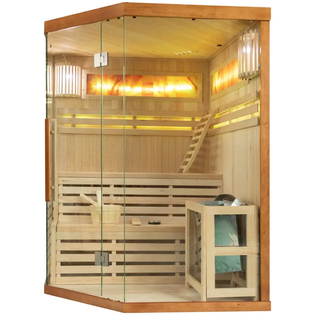 Sauna fińska narożna Nordum Solea 3-osobowa brązowa została zaprojektowana z myślą o maksymalnym komforcie użytkowania. Ergonomiczne siedzenia zapewniają wygodę podczas relaksu. Wnętrze jest oświetlone, a punkty światła rozmieszczone tak, aby wprowadzać w stan głębokiego odprężenia. To jeszcze nie koniec, sauna fińska narożna z panelami solnymi wyposażona jest ceber z chochlą na wodę do zraszania kamieni, higrometr i klepsydrę. Te akcesoria umożliwiają bezpieczne saunowanie.