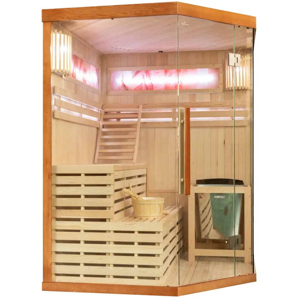 Ściany naszych saun wewnętrznych wykonane są z drewna jodły kanadyjskiej, a przestrzeń między warstwą zewnętrzną i wewnętrzną wypełniona jest izolacją z wełny mineralnej. Dzięki swoim właściwościom, takim jak ognioodporność, odporność na wilgoć i paroprzepuszczalność, zapewnia ona nie tylko bezpieczeństwo ale także optymalne warunki do korzystania z sauny w ekonomiczny sposób. Panele solne mogą wpływać na poprawę komfortu przebywania w pomieszczeniu poprzez jonizację powietrza. Dodatkowo tworzą przyjemną atmosferę sprzyjającą relaksowi i wyciszeniu.