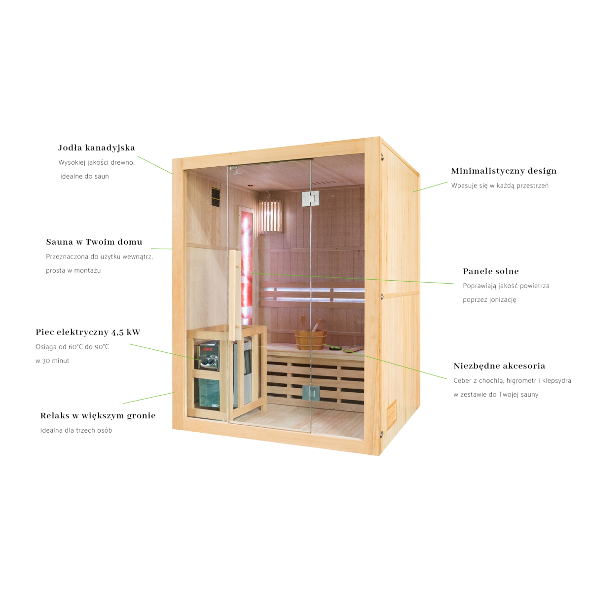 oświetlenie wewnętrzne z osobną wtyczką zasilania, piec i kamienie, ceber z chochlą na wodę do zraszania kamieni, higrometr (pomiar wilgotności), klepsydra (do odmierzania czasu seansu w saunie), dodatkowe oświetlenie LED RGB, panele solne