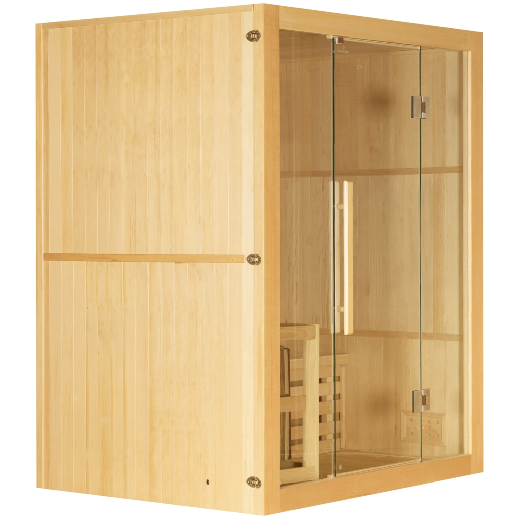 Sauna fińska z panelami solnymi 3-osobowa wykonana jest z jodły kanadyjskiej, przez co odznacza się eleganckim i ponadczasowym designem. Jej wymiary (150 cm x 120 cm x 190 cm) pozwalają na łatwe dopasowanie do różnych przestrzeni wewnętrznych czy to w domu prywatnym, czy w domku letniskowym. Dzięki grubym, 6-centymetrowym ściankom, sauna fińska skutecznie zatrzymuje ciepło w środku, tworząc gorący, a zarazem wilgotny mikroklimat sprzyjający odprężeniu.