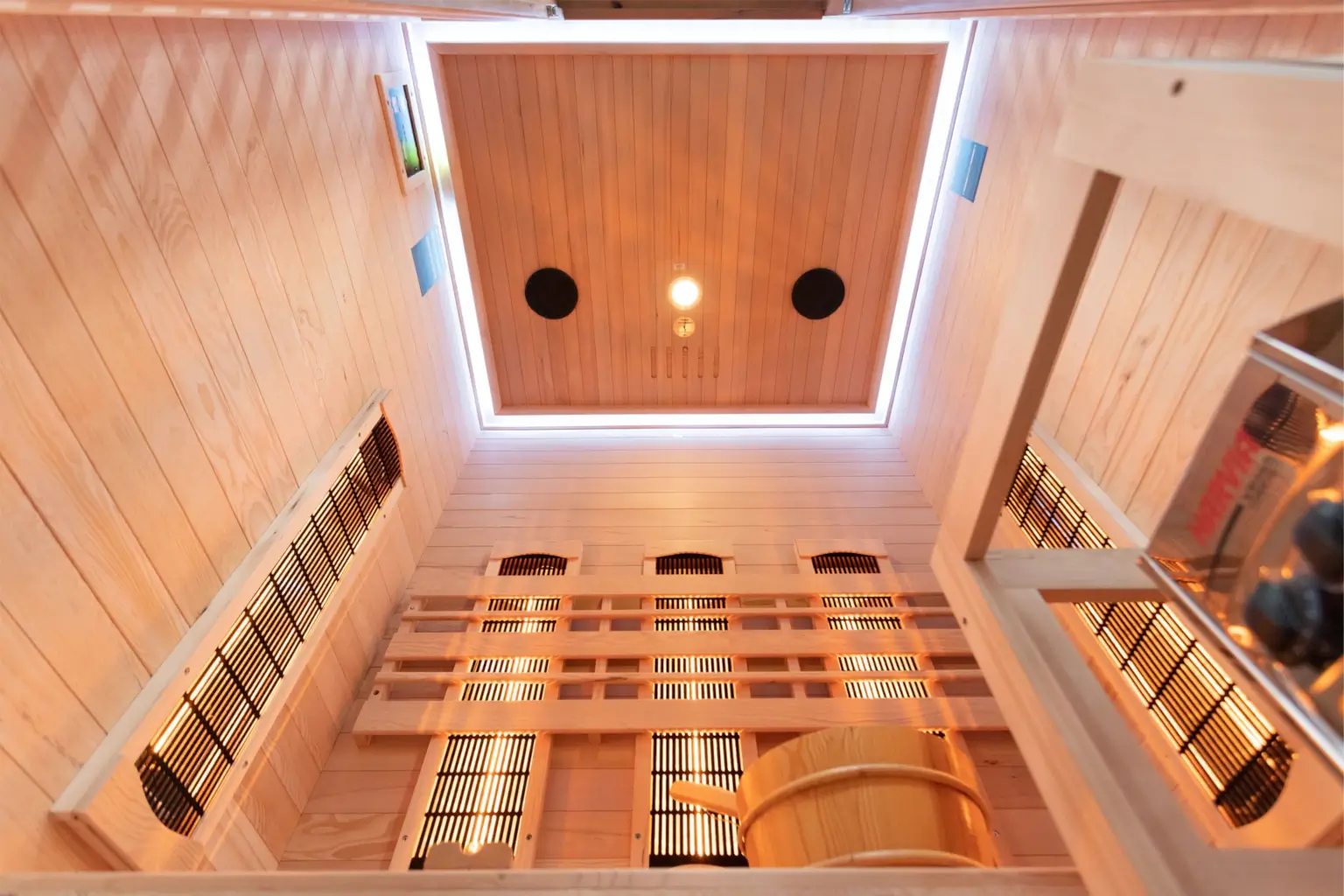 Ściany naszych saun wewnętrznych wykonane są z drewna jodły kanadyjskiej, a przestrzeń między warstwą zewnętrzną i wewnętrzną wypełniona jest izolacją z wełny mineralnej. Dzięki swoim właściwościom, takim jak ognioodporność, odporność na wilgoć i paroprzepuszczalność, zapewnia ona nie tylko bezpieczeństwo ale także optymalne warunki do korzystania z sauny w ekonomiczny sposób.