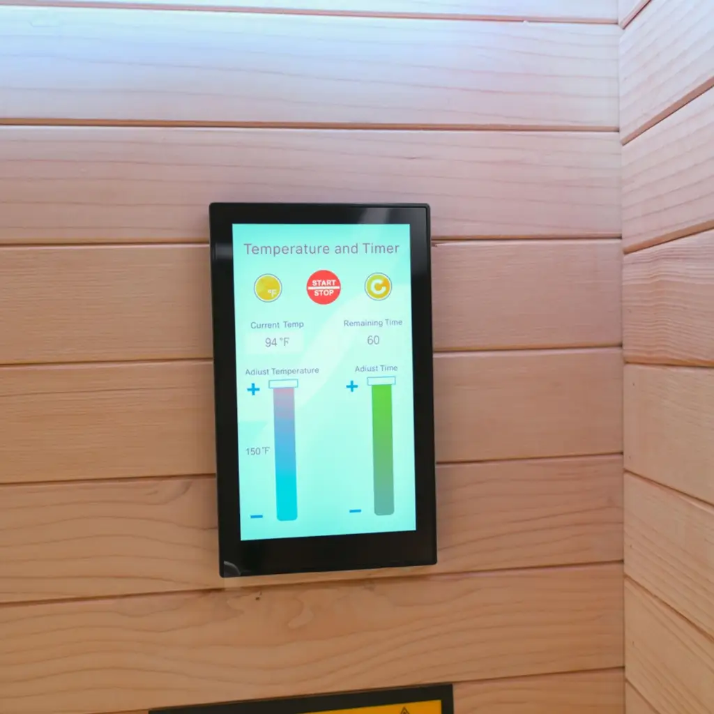 • radio multimedialne z BT • dwa stereofoniczne głośniki zamocowane w suficie sauny • panel sterujący wewnętrzny z modułem WiFi (moduł WiFi pozwala nam na uruchomienie sauny zdalnie, a wewnętrzny panel umożliwia zmianę parametrów pracy sauny bez konieczności wychodzenia z sauny podczas relaksu) • jonizator powietrza odświeżający powietrze i redukujący nieprzyjemne zapachy • system relaksacyjnego oświetlenia umożliwiający ustawienie częstotliwości kolorowych świateł • dwa potencjometry pozwalające ustawić moc promienników na plecach • oświetlenie zewnętrzne i wewnętrzne • drzwi z hartowanego szkła • panele solne