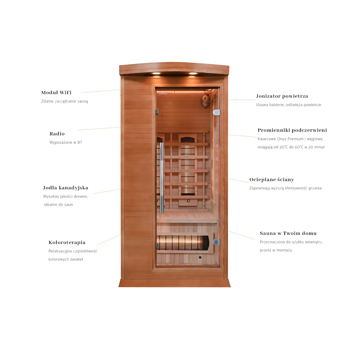 Zastosowanie promienników kwarcowych Onyx Premium jest nowoczesnym rozwiązaniem o najszerszym zakresie działania promieniowania podczerwieni. Korzystanie z sauny wyposażonej w promienniki kwarcowe sprzyja relaksowi oraz poprawie samopoczucia. Seanse o długości od 15 do 30 minut w temperaturze od 45 do 50 stopni Celsjusza mogą sprzyjać odprężeniu, poprawie wyglądu skóry oraz pracy nad sylwetką i redukcji widoczności cellulitu. Z dobroczynnego wpływu sauny można korzystać nawet codziennie. Sauny IR sprzyjają redukcji stresu. Poprawiają elastyczność skóry, wygładzają jej wygląd a także mają pozytywny wpływ na wzrost sił witalnych.