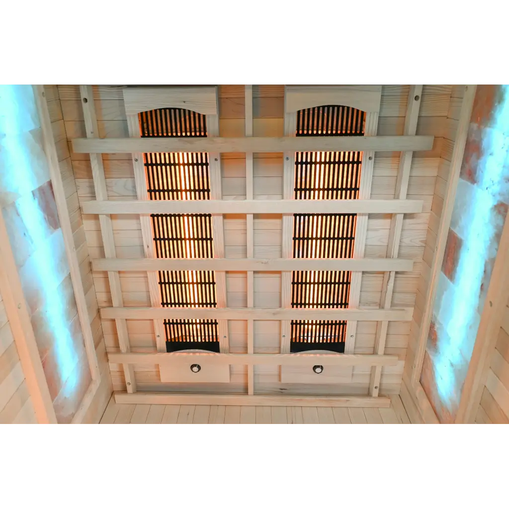 Sauna infrared z panelami solnymi wykorzystuje promieniowanie podczerwone, generowane przez 5 promienników (kwarcowe Onyx Premium – 2 × 350 W, 2 × 400 kW; węglowe – 1 × 80 W). Wiązki światła docierają do głębszych warstw skóry, sprzyjając jej rozgrzaniu oraz poprawie wyglądu.